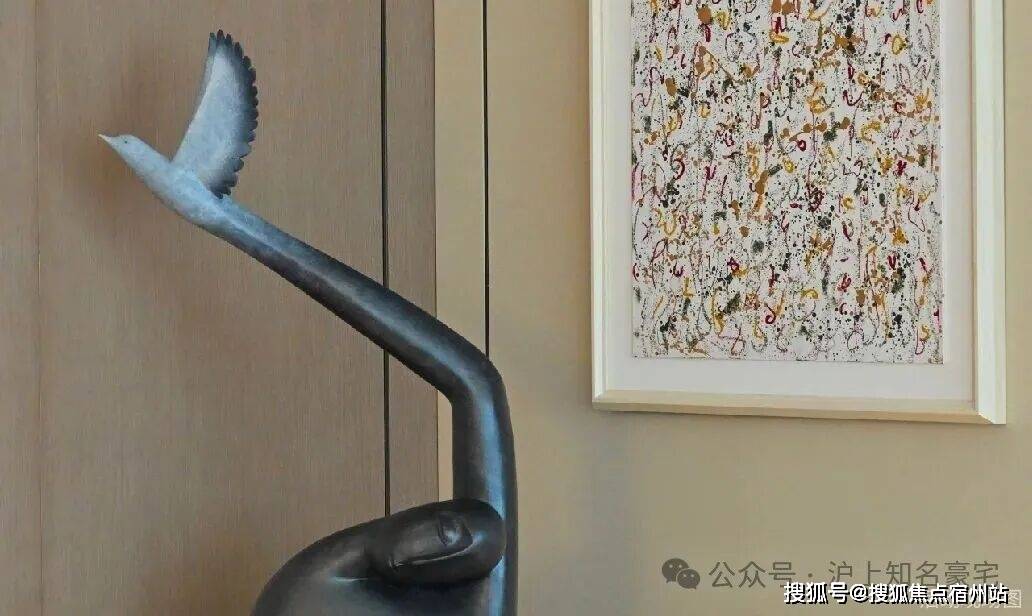 展示空间中-软装极富艺术趣味!比如:青铜雕塑《我心飞翔》玄关油画《飞翔的羽毛》野崎信次郎《彩の花束》!